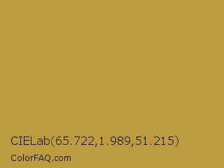 CIELab 65.722,1.989,51.215 Color is a normal orange color and the nearest color is Brass #b5a642. Hex code #bd9c40 and RGB value is rgb(189,156,64). In RGB color space, this color is composed of 74% red, 61% green, 25% blue, In CMYK color space, this color is composed of 0% cyan, 17% magenta, 66% yellow , 26% black , In HSL color space, this color has a hue angle of 44° , 49% saturation and 50% lightness.