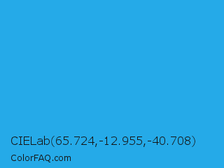 CIELab 65.724,-12.955,-40.708 Color is a normal blue color and the nearest color is Button Blue #24a0ed. Hex code #25aae8 and RGB value is rgb(37,170,232). In RGB color space, this color is composed of 15% red, 67% green, 91% blue, In CMYK color space, this color is composed of 84% cyan, 27% magenta, 0% yellow , 9% black , In HSL color space, this color has a hue angle of 199° , 81% saturation and 53% lightness.