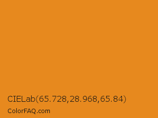 CIELab 65.728,28.968,65.84 Color is a normal orange color and the nearest color is Zest #e5841b. Hex code #e7891e and RGB value is rgb(231,137,30). In RGB color space, this color is composed of 91% red, 54% green, 12% blue, In CMYK color space, this color is composed of 0% cyan, 41% magenta, 87% yellow , 9% black , In HSL color space, this color has a hue angle of 32° , 81% saturation and 51% lightness.