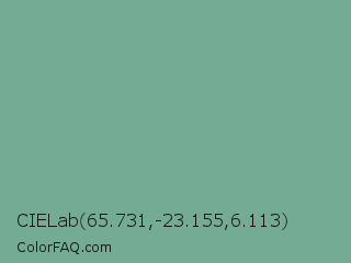 CIELab 65.731,-23.155,6.113 Color is a normal green color and the nearest color is Bay Leaf #7da98d. Hex code #74ab94 and RGB value is rgb(116,171,148). In RGB color space, this color is composed of 45% red, 67% green, 58% blue, In CMYK color space, this color is composed of 32% cyan, 0% magenta, 13% yellow , 33% black , In HSL color space, this color has a hue angle of 155° , 25% saturation and 56% lightness.
