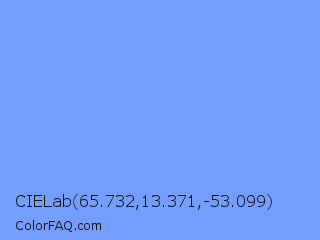 CIELab 65.732,13.371,-53.099 Color is a light blue color and the nearest color is French Sky Blue #77b5fe. Hex code #739dff and RGB value is rgb(115,157,255). In RGB color space, this color is composed of 45% red, 62% green, 100% blue, In CMYK color space, this color is composed of 55% cyan, 38% magenta, 0% yellow , 0% black , In HSL color space, this color has a hue angle of 222° , 100% saturation and 73% lightness.