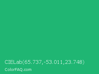 CIELab 65.737,-53.011,23.748 Color is a normal green color and the nearest color is Green Crayola #1cac78. Hex code #1fb673 and RGB value is rgb(31,182,115). In RGB color space, this color is composed of 12% red, 71% green, 45% blue, In CMYK color space, this color is composed of 83% cyan, 0% magenta, 37% yellow , 29% black , In HSL color space, this color has a hue angle of 153° , 71% saturation and 42% lightness.