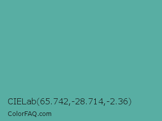 CIELab 65.742,-28.714,-2.36 Color is a normal cyan color and the nearest color is Tradewind #5fb3ac. Hex code #58aea3 and RGB value is rgb(88,174,163). In RGB color space, this color is composed of 35% red, 68% green, 64% blue, In CMYK color space, this color is composed of 49% cyan, 0% magenta, 6% yellow , 32% black , In HSL color space, this color has a hue angle of 172° , 35% saturation and 51% lightness.