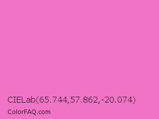 CIELab 65.744,57.862,-20.074 Color is a light magenta color and the nearest color is Persian Pink #f77fbe. Hex code #f173c5 and RGB value is rgb(241,115,197). In RGB color space, this color is composed of 95% red, 45% green, 77% blue, In CMYK color space, this color is composed of 0% cyan, 52% magenta, 18% yellow , 5% black , In HSL color space, this color has a hue angle of 321° , 82% saturation and 70% lightness.