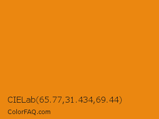 CIELab 65.77,31.434,69.44 Color is a normal orange color and the nearest color is Golden Bell #e28913. Hex code #eb8710 and RGB value is rgb(235,135,16). In RGB color space, this color is composed of 92% red, 53% green, 6% blue, In CMYK color space, this color is composed of 0% cyan, 43% magenta, 93% yellow , 8% black , In HSL color space, this color has a hue angle of 33° , 87% saturation and 49% lightness.