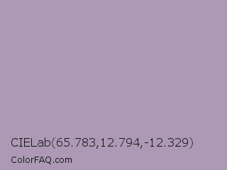 CIELab 65.783,12.794,-12.329 Color is a light purple color and the nearest color is Glossy Grape #ab92b3. Hex code #ad99b6 and RGB value is rgb(173,153,182). In RGB color space, this color is composed of 68% red, 60% green, 71% blue, In CMYK color space, this color is composed of 5% cyan, 16% magenta, 0% yellow , 29% black , In HSL color space, this color has a hue angle of 281° , 17% saturation and 66% lightness.