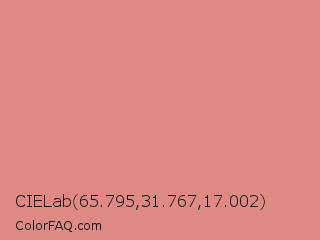 CIELab 65.795,31.767,17.002 Color is a light red color and the nearest color is New York Pink #d7837f. Hex code #de8983 and RGB value is rgb(222,137,131). In RGB color space, this color is composed of 87% red, 54% green, 51% blue, In CMYK color space, this color is composed of 0% cyan, 38% magenta, 41% yellow , 13% black , In HSL color space, this color has a hue angle of 4° , 58% saturation and 69% lightness.
