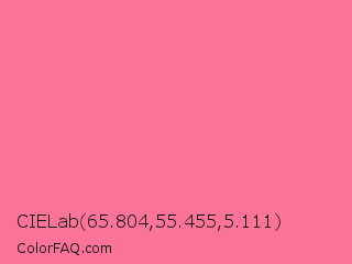 CIELab 65.804,55.455,5.111 Color is a light rose color and the nearest color is French Pink #fd6c9e. Hex code #fb7399 and RGB value is rgb(251,115,153). In RGB color space, this color is composed of 98% red, 45% green, 60% blue, In CMYK color space, this color is composed of 0% cyan, 54% magenta, 39% yellow , 2% black , In HSL color space, this color has a hue angle of 343° , 94% saturation and 72% lightness.