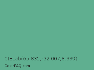 CIELab 65.831,-32.007,8.339 Color is a normal green color and the nearest color is Silver Tree #66b58f. Hex code #5faf90 and RGB value is rgb(95,175,144). In RGB color space, this color is composed of 37% red, 69% green, 56% blue, In CMYK color space, this color is composed of 46% cyan, 0% magenta, 18% yellow , 31% black , In HSL color space, this color has a hue angle of 157° , 33% saturation and 53% lightness.