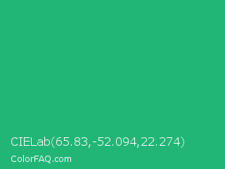 CIELab 65.83,-52.094,22.274 Color is a normal green color and the nearest color is Green Crayola #1cac78. Hex code #22b676 and RGB value is rgb(34,182,118). In RGB color space, this color is composed of 13% red, 71% green, 46% blue, In CMYK color space, this color is composed of 81% cyan, 0% magenta, 35% yellow , 29% black , In HSL color space, this color has a hue angle of 154° , 69% saturation and 42% lightness.
