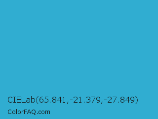 CIELab 65.841,-21.379,-27.849 Color is a normal cyan color and the nearest color is Ball Blue #21abcd. Hex code #30add1 and RGB value is rgb(48,173,209). In RGB color space, this color is composed of 19% red, 68% green, 82% blue, In CMYK color space, this color is composed of 77% cyan, 17% magenta, 0% yellow , 18% black , In HSL color space, this color has a hue angle of 193° , 64% saturation and 50% lightness.