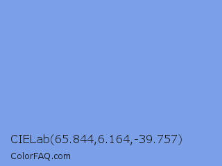 CIELab 65.844,6.164,-39.757 Color is a light blue color and the nearest color is Vista Blue #7c9ed9. Hex code #7ba0e7 and RGB value is rgb(123,160,231). In RGB color space, this color is composed of 48% red, 63% green, 91% blue, In CMYK color space, this color is composed of 47% cyan, 31% magenta, 0% yellow , 9% black , In HSL color space, this color has a hue angle of 219° , 69% saturation and 69% lightness.