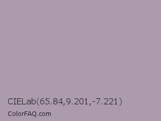 CIELab 65.84,9.201,-7.221 Color is a light magenta color and the nearest color is Heliotrope Gray #aa98a9. Hex code #ab9bad and RGB value is rgb(171,155,173). In RGB color space, this color is composed of 67% red, 61% green, 68% blue, In CMYK color space, this color is composed of 1% cyan, 10% magenta, 0% yellow , 32% black , In HSL color space, this color has a hue angle of 293° , 10% saturation and 64% lightness.