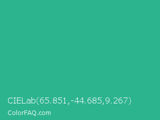 CIELab 65.851,-44.685,9.267 Color is a normal green color and the nearest color is Mountain Meadow #30ba8f. Hex code #2cb48e and RGB value is rgb(44,180,142). In RGB color space, this color is composed of 17% red, 71% green, 56% blue, In CMYK color space, this color is composed of 76% cyan, 0% magenta, 21% yellow , 29% black , In HSL color space, this color has a hue angle of 163° , 61% saturation and 44% lightness.
