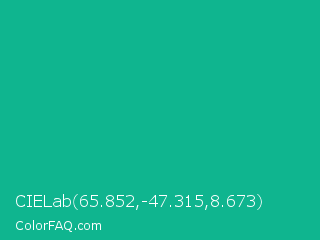 CIELab 65.852,-47.315,8.673 Color is a normal cyan color and the nearest color is Mountain Meadow Crayola #1ab385. Hex code #0fb58f and RGB value is rgb(15,181,143). In RGB color space, this color is composed of 6% red, 71% green, 56% blue, In CMYK color space, this color is composed of 92% cyan, 0% magenta, 21% yellow , 29% black , In HSL color space, this color has a hue angle of 166° , 85% saturation and 38% lightness.