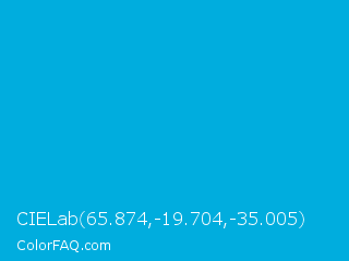 CIELab 65.874,-19.704,-35.005 Color is a normal cyan color and the nearest color is Cerulean #02a4d3. Hex code #00adde and RGB value is rgb(0,173,222). In RGB color space, this color is composed of 0% red, 68% green, 87% blue, In CMYK color space, this color is composed of 100% cyan, 22% magenta, 0% yellow , 13% black , In HSL color space, this color has a hue angle of 193° , 100% saturation and 44% lightness.