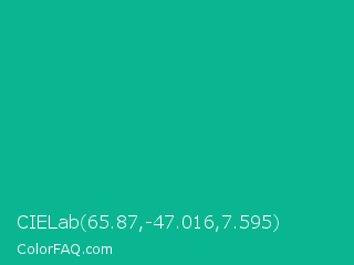 CIELab 65.87,-47.016,7.595 Color is a normal cyan color and the nearest color is Persian Green #00a693. Hex code #0ab591 and RGB value is rgb(10,181,145). In RGB color space, this color is composed of 4% red, 71% green, 57% blue, In CMYK color space, this color is composed of 94% cyan, 0% magenta, 20% yellow , 29% black , In HSL color space, this color has a hue angle of 167° , 90% saturation and 37% lightness.