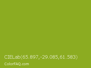 CIELab 65.897,-29.085,61.583 Color is a normal lime color and the nearest color is Citron #9fa91f. Hex code #8cac21 and RGB value is rgb(140,172,33). In RGB color space, this color is composed of 55% red, 67% green, 13% blue, In CMYK color space, this color is composed of 19% cyan, 0% magenta, 81% yellow , 33% black , In HSL color space, this color has a hue angle of 74° , 68% saturation and 40% lightness.
