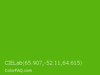 CIELab 65.907,-52.11,64.615 Color is a normal green color and the nearest color is Kelly Green #4cbb17. Hex code #59b50e and RGB value is rgb(89,181,14). In RGB color space, this color is composed of 35% red, 71% green, 5% blue, In CMYK color space, this color is composed of 51% cyan, 0% magenta, 92% yellow , 29% black , In HSL color space, this color has a hue angle of 93° , 86% saturation and 38% lightness.