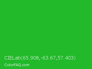 CIELab 65.908,-63.67,57.403 Color is a normal green color and the nearest color is Wageningen Green #34b233. Hex code #22b92a and RGB value is rgb(34,185,42). In RGB color space, this color is composed of 13% red, 73% green, 16% blue, In CMYK color space, this color is composed of 82% cyan, 0% magenta, 77% yellow , 27% black , In HSL color space, this color has a hue angle of 123° , 69% saturation and 43% lightness.