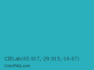 CIELab 65.917,-29.915,-16.67 Color is a normal cyan color and the nearest color is Maximum Blue Green #30bfbf. Hex code #2ab0bd and RGB value is rgb(42,176,189). In RGB color space, this color is composed of 16% red, 69% green, 74% blue, In CMYK color space, this color is composed of 78% cyan, 7% magenta, 0% yellow , 26% black , In HSL color space, this color has a hue angle of 185° , 64% saturation and 45% lightness.