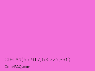 CIELab 65.917,63.725,-31 Color is a light magenta color and the nearest color is Rose Pink #ff66cc. Hex code #f36ed9 and RGB value is rgb(243,110,217). In RGB color space, this color is composed of 95% red, 43% green, 85% blue, In CMYK color space, this color is composed of 0% cyan, 55% magenta, 11% yellow , 5% black , In HSL color space, this color has a hue angle of 312° , 85% saturation and 69% lightness.