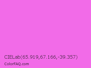 CIELab 65.919,67.166,-39.357 Color is a light magenta color and the nearest color is Lavender Magenta #ee82ee. Hex code #f26be8 and RGB value is rgb(242,107,232). In RGB color space, this color is composed of 95% red, 42% green, 91% blue, In CMYK color space, this color is composed of 0% cyan, 56% magenta, 4% yellow , 5% black , In HSL color space, this color has a hue angle of 304° , 84% saturation and 68% lightness.