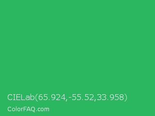 CIELab 65.924,-55.52,33.958 Color is a normal green color and the nearest color is Medium Sea Green #3cb371. Hex code #2bb760 and RGB value is rgb(43,183,96). In RGB color space, this color is composed of 17% red, 72% green, 38% blue, In CMYK color space, this color is composed of 77% cyan, 0% magenta, 48% yellow , 28% black , In HSL color space, this color has a hue angle of 143° , 62% saturation and 44% lightness.
