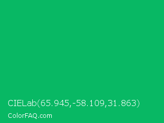 CIELab 65.945,-58.109,31.863 Color is a normal green color and the nearest color is GO Green #00ab66. Hex code #08b864 and RGB value is rgb(8,184,100). In RGB color space, this color is composed of 3% red, 72% green, 39% blue, In CMYK color space, this color is composed of 96% cyan, 0% magenta, 46% yellow , 28% black , In HSL color space, this color has a hue angle of 151° , 92% saturation and 38% lightness.