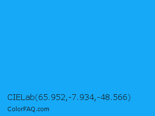 CIELab 65.952,-7.934,-48.566 Color is a normal blue color and the nearest color is Button Blue #24a0ed. Hex code #16a9f7 and RGB value is rgb(22,169,247). In RGB color space, this color is composed of 9% red, 66% green, 97% blue, In CMYK color space, this color is composed of 91% cyan, 32% magenta, 0% yellow , 3% black , In HSL color space, this color has a hue angle of 201° , 93% saturation and 53% lightness.
