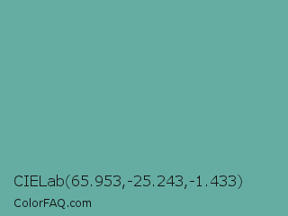 CIELab 65.953,-25.243,-1.433 Color is a normal cyan color and the nearest color is Green Sheen #6eaea1. Hex code #65ada2 and RGB value is rgb(101,173,162). In RGB color space, this color is composed of 40% red, 68% green, 64% blue, In CMYK color space, this color is composed of 42% cyan, 0% magenta, 6% yellow , 32% black , In HSL color space, this color has a hue angle of 171° , 31% saturation and 54% lightness.