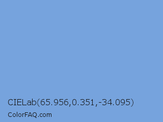 CIELab 65.956,0.351,-34.095 Color is a light blue color and the nearest color is Vista Blue #7c9ed9. Hex code #76a3dd and RGB value is rgb(118,163,221). In RGB color space, this color is composed of 46% red, 64% green, 87% blue, In CMYK color space, this color is composed of 47% cyan, 26% magenta, 0% yellow , 13% black , In HSL color space, this color has a hue angle of 214° , 60% saturation and 66% lightness.
