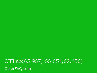 CIELab 65.967,-66.651,62.456 Color is a normal green color and the nearest color is Vivid Malachite #00cc33. Hex code #0fba17 and RGB value is rgb(15,186,23). In RGB color space, this color is composed of 6% red, 73% green, 9% blue, In CMYK color space, this color is composed of 92% cyan, 0% magenta, 88% yellow , 27% black , In HSL color space, this color has a hue angle of 123° , 85% saturation and 39% lightness.