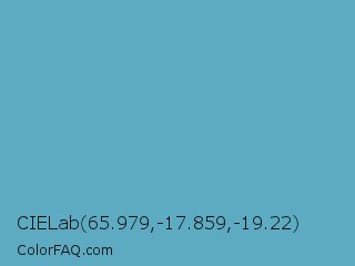 CIELab 65.979,-17.859,-19.22 Color is a normal blue color and the nearest color is Fountain Blue #56b4be. Hex code #5cabc2 and RGB value is rgb(92,171,194). In RGB color space, this color is composed of 36% red, 67% green, 76% blue, In CMYK color space, this color is composed of 53% cyan, 12% magenta, 0% yellow , 24% black , In HSL color space, this color has a hue angle of 194° , 46% saturation and 56% lightness.