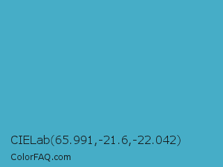 CIELab 65.991,-21.6,-22.042 Color is a normal cyan color and the nearest color is Maximum Blue #47abcc. Hex code #46adc7 and RGB value is rgb(70,173,199). In RGB color space, this color is composed of 27% red, 68% green, 78% blue, In CMYK color space, this color is composed of 65% cyan, 13% magenta, 0% yellow , 22% black , In HSL color space, this color has a hue angle of 192° , 54% saturation and 53% lightness.