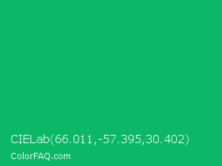 CIELab 66.011,-57.395,30.402 Color is a normal green color and the nearest color is GO Green #00ab66. Hex code #0cb867 and RGB value is rgb(12,184,103). In RGB color space, this color is composed of 5% red, 72% green, 40% blue, In CMYK color space, this color is composed of 93% cyan, 0% magenta, 44% yellow , 28% black , In HSL color space, this color has a hue angle of 152° , 88% saturation and 38% lightness.