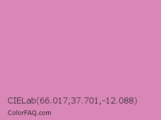 CIELab 66.017,37.701,-12.088 Color is a light magenta color and the nearest color is Middle Purple #d982b5. Hex code #d887b7 and RGB value is rgb(216,135,183). In RGB color space, this color is composed of 85% red, 53% green, 72% blue, In CMYK color space, this color is composed of 0% cyan, 38% magenta, 15% yellow , 15% black , In HSL color space, this color has a hue angle of 324° , 51% saturation and 69% lightness.
