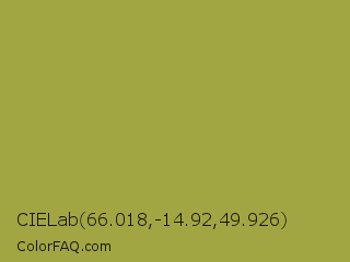 CIELab 66.018,-14.92,49.926 Color is a normal yellow color and the nearest color is Brass #b5a642. Hex code #a2a642 and RGB value is rgb(162,166,66). In RGB color space, this color is composed of 64% red, 65% green, 26% blue, In CMYK color space, this color is composed of 2% cyan, 0% magenta, 60% yellow , 35% black , In HSL color space, this color has a hue angle of 62° , 43% saturation and 45% lightness.