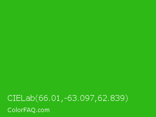 CIELab 66.01,-63.097,62.839 Color is a normal green color and the nearest color is Harlequin Green #46cb18. Hex code #2eb916 and RGB value is rgb(46,185,22). In RGB color space, this color is composed of 18% red, 73% green, 9% blue, In CMYK color space, this color is composed of 75% cyan, 0% magenta, 88% yellow , 27% black , In HSL color space, this color has a hue angle of 111° , 79% saturation and 41% lightness.