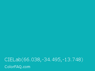 CIELab 66.038,-34.495,-13.748 Color is a normal cyan color and the nearest color is Tiffany Blue #0abab5. Hex code #0bb2b8 and RGB value is rgb(11,178,184). In RGB color space, this color is composed of 4% red, 70% green, 72% blue, In CMYK color space, this color is composed of 94% cyan, 3% magenta, 0% yellow , 28% black , In HSL color space, this color has a hue angle of 182° , 89% saturation and 38% lightness.