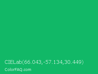 CIELab 66.043,-57.134,30.449 Color is a normal green color and the nearest color is GO Green #00ab66. Hex code #11b867 and RGB value is rgb(17,184,103). In RGB color space, this color is composed of 7% red, 72% green, 40% blue, In CMYK color space, this color is composed of 91% cyan, 0% magenta, 44% yellow , 28% black , In HSL color space, this color has a hue angle of 151° , 83% saturation and 39% lightness.