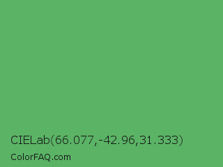 CIELab 66.077,-42.96,31.333 Color is a normal green color and the nearest color is Fern #63b76c. Hex code #5bb366 and RGB value is rgb(91,179,102). In RGB color space, this color is composed of 36% red, 70% green, 40% blue, In CMYK color space, this color is composed of 49% cyan, 0% magenta, 43% yellow , 30% black , In HSL color space, this color has a hue angle of 128° , 37% saturation and 53% lightness.