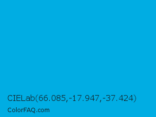 CIELab 66.085,-17.947,-37.424 Color is a normal blue color and the nearest color is Vivid Cerulean #00aaee. Hex code #00ade3 and RGB value is rgb(0,173,227). In RGB color space, this color is composed of 0% red, 68% green, 89% blue, In CMYK color space, this color is composed of 100% cyan, 24% magenta, 0% yellow , 11% black , In HSL color space, this color has a hue angle of 194° , 100% saturation and 45% lightness.