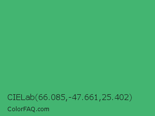 CIELab 66.085,-47.661,25.402 Color is a normal green color and the nearest color is Medium Sea Green #3cb371. Hex code #43b571 and RGB value is rgb(67,181,113). In RGB color space, this color is composed of 26% red, 71% green, 44% blue, In CMYK color space, this color is composed of 63% cyan, 0% magenta, 38% yellow , 29% black , In HSL color space, this color has a hue angle of 144° , 46% saturation and 49% lightness.