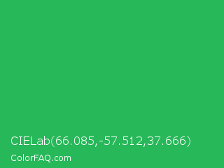 CIELab 66.085,-57.512,37.666 Color is a normal green color and the nearest color is Chateau Green #40a860. Hex code #27b859 and RGB value is rgb(39,184,89). In RGB color space, this color is composed of 15% red, 72% green, 35% blue, In CMYK color space, this color is composed of 79% cyan, 0% magenta, 52% yellow , 28% black , In HSL color space, this color has a hue angle of 141° , 65% saturation and 44% lightness.