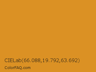 CIELab 66.088,19.792,63.692 Color is a normal orange color and the nearest color is Geebung #d18f1b. Hex code #db9124 and RGB value is rgb(219,145,36). In RGB color space, this color is composed of 86% red, 57% green, 14% blue, In CMYK color space, this color is composed of 0% cyan, 34% magenta, 84% yellow , 14% black , In HSL color space, this color has a hue angle of 36° , 72% saturation and 50% lightness.
