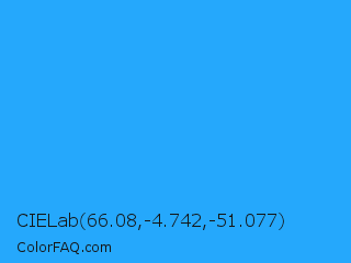 CIELab 66.08,-4.742,-51.077 Color is a normal blue color and the nearest color is Button Blue #24a0ed. Hex code #25a8fc and RGB value is rgb(37,168,252). In RGB color space, this color is composed of 15% red, 66% green, 99% blue, In CMYK color space, this color is composed of 85% cyan, 33% magenta, 0% yellow , 1% black , In HSL color space, this color has a hue angle of 203° , 97% saturation and 57% lightness.