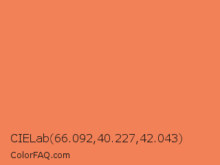 CIELab 66.092,40.227,42.043 Color is a light orange color and the nearest color is Coral #ff7f50. Hex code #f38157 and RGB value is rgb(243,129,87). In RGB color space, this color is composed of 95% red, 51% green, 34% blue, In CMYK color space, this color is composed of 0% cyan, 47% magenta, 64% yellow , 5% black , In HSL color space, this color has a hue angle of 16° , 87% saturation and 65% lightness.