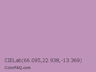 CIELab 66.095,22.938,-13.369 Color is a light magenta color and the nearest color is Pastel Purple #b39eb5. Hex code #bf93b9 and RGB value is rgb(191,147,185). In RGB color space, this color is composed of 75% red, 58% green, 73% blue, In CMYK color space, this color is composed of 0% cyan, 23% magenta, 3% yellow , 25% black , In HSL color space, this color has a hue angle of 308° , 26% saturation and 66% lightness.