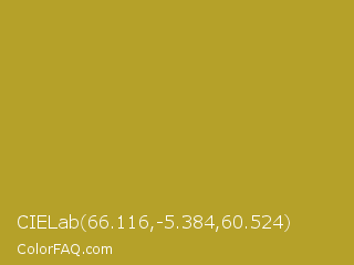CIELab 66.116,-5.384,60.524 Color is a normal yellow color and the nearest color is Lemon Ginger #ac9e22. Hex code #b5a129 and RGB value is rgb(181,161,41). In RGB color space, this color is composed of 71% red, 63% green, 16% blue, In CMYK color space, this color is composed of 0% cyan, 11% magenta, 77% yellow , 29% black , In HSL color space, this color has a hue angle of 51° , 63% saturation and 44% lightness.